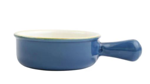 SMALL ROUND BLUE BAKER W/LARGE HANDLE